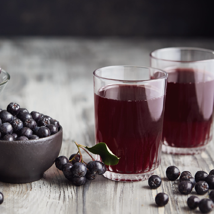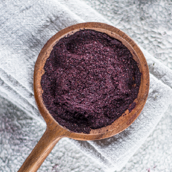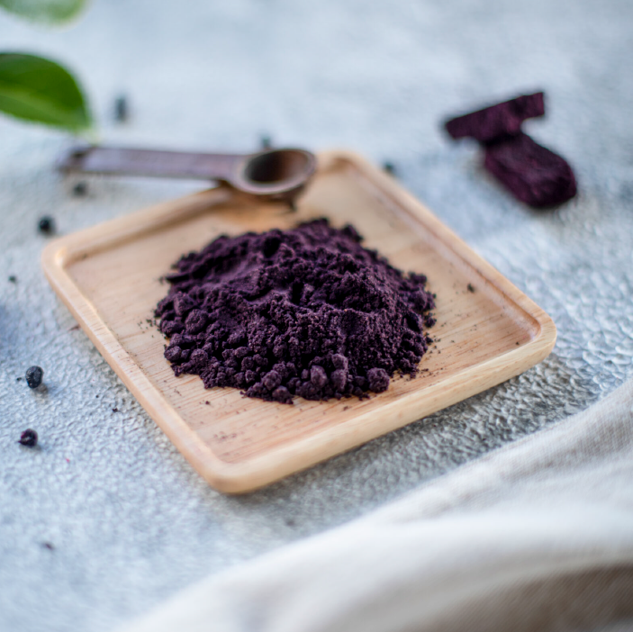 Polvo obtenido del jugo de frutos maduros de saúco (Sambucus nigra), atomizado para conservar su riqueza natural en flavonoides, quercetina y antocianinas. Presenta un color púrpura oscuro, con aroma y sabor característicos, ligeramente ácidos.