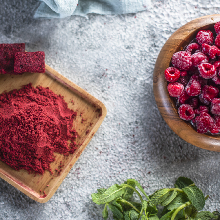 El jugo en polvo de frambuesa (Rubus idaeus) destaca por su intenso sabor, color natural y riqueza en antioxidantes y elegitanina. A través de la tecnología de spray drying, se obtiene un ingrediente en polvo altamente soluble, estable y con gran poder sensorial.