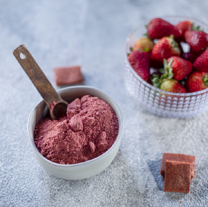 El jugo en polvo de frutilla es una solución versátil para la industria alimentaria, producido a partir de jugo concentrado de frutilla (Fragaria), este polvo mantiene un buen contenido de pelargonidina, compuestos fenólicos y antioxidantes naturales.